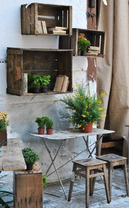 Полочки для растений в горшках или мелочей, которые могут пригодиться под рукой, можно повесить и с внешней стены дома. Используйте старые деревянные ящики, например, из-под винных бутылок, покройте их морилкой или краской и закрепите на стене дома или террасы поближе к месту, где вы отдыхаете или занимаетесь садовой работой. Полочки, как в интерьере, будут смотреться уютно и оригинально и могут быть весьма полезны, например, при сервировке стола на открытом воздухе или для хранения инструментов.