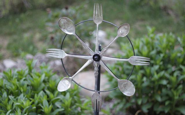 Вертящийся на ветру флюгер не только помогает отогнать от посадок непрошенных гостей, но и радует глаз в особенности младшего поколения. Сделать садовый флюгер можно своими руками из того, что найдется под рукой, например, из старых столовых приборов.