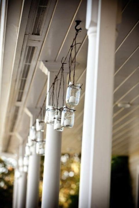 Свет свечей помогает создать уютную атмосферу не только в доме, но и на улице. Чтобы вечерние посиделки с семьей и друзьями стали еще теплее, расставьте вдоль тропинки или подвесьте проволокой к крыше террасы или беседки простые баночки со свечками и зажгите их с наступлением темноты. Такие подсвечники ничего не будут стоить, при этом безопасны и прекрасно смотрятся.