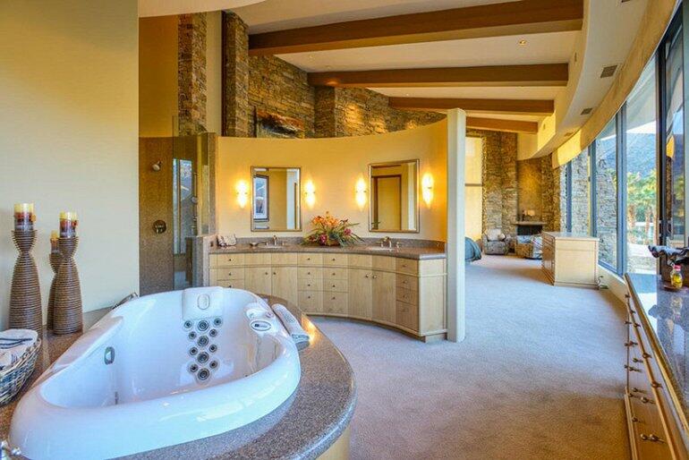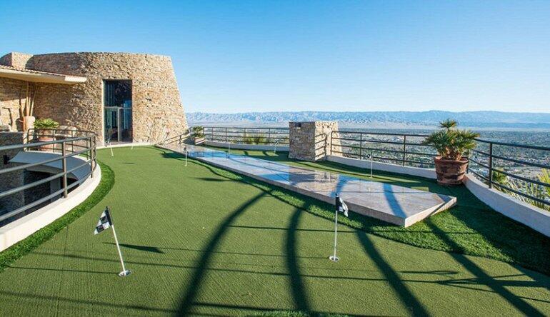 Другие забавные моменты La Piedra включают лужайку для гольфа на террасе, встроенный наружный гриль, дизайнерскую мебель, террасы, бар у бассейна (имеется почти в каждом доме Палм-Спрингс) и главную комнату с высокими потолками и панорамным обзорным окном.