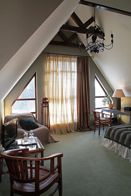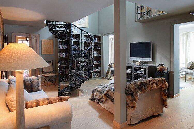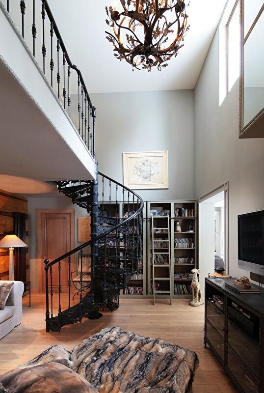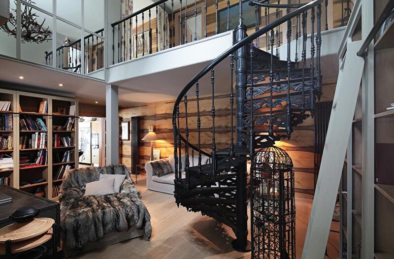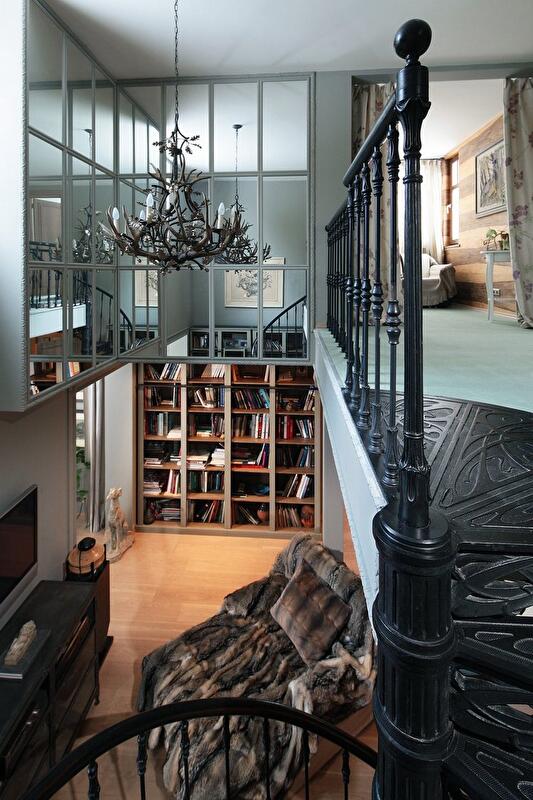 Второй ярус занимают две спальни, в которых бережно сохранены скошенные потолки и деревянные балки. Интерьер гармонично сочетает в себе характерные особенности русской усадьбы и европейского шале. В угоду последнему стены оформлены массивными панелями из разных сортов дерева, мебель обита светлым холстом, в качестве декора используются шкуры животных, потолок украшает причудливая люстра из оленьих рогов. Но главным визуальным акцентом пространства, безусловно, стала витая чугунная лестница, ведущая в хозяйскую часть дома, — изящная ажурная конструкция изготовлена по эскизам автора проекта.