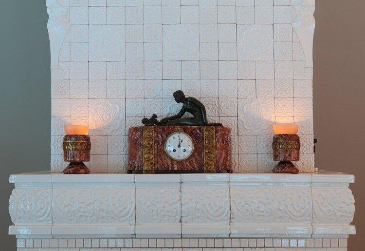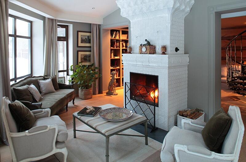 Камин, облицованный белоснежными изразцами, создан по эскизам автора проекта в стиле русских усадебных печей 18-19 веков.