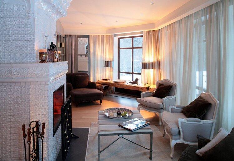 Изначально особняк представлял собой деревянный сруб, который обновили и немного расширили: старые деревянные конструкции заменили, пристроили остекленную веранду. На первом этаже расположились общественные зоны. Кухня объединена со столовой, а гостиная одновременно играет роль библиотеки и зала с камином в виде русской печи с изразцами — без этой детали не обходилось ни одно русское поместье.