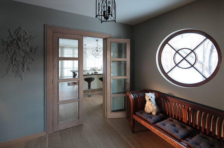 «Дом стоит в старом яблоневом саду, который переходит в лес, спускающийся к реке. Этот дивный русский пейзаж хорошо виден из хозяйской спальни, а сам сад как бы наполняет собой всё пространство первого этажа через большие окна. Поэтому спокойный интерьер в нейтральных тонах лучше всего соответствует такому окружению».