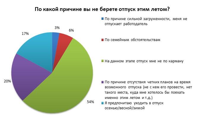 По словам большинства респондентов (54%) этим летом отпуск им не по карману. Каждый пятый не видит четких планов на это время, а потому предпочитает не тратить отпускные дни впустую. А 17% опрошенных предпочитают выбирать для отпуска не летнее время года.