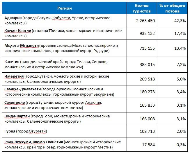Предпочтение определенных видов туризма у туристов из разных стран отразилось на перечне наиболее популярных регионов Грузии.