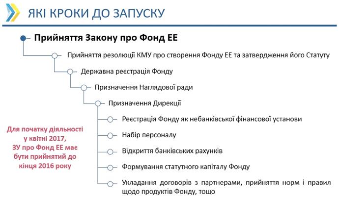 У липні 2016 року уряд схвалив концепцію створення фонду, а зараз вже є проект закону. Щоб фонд запрацював у квітні 2017 року, і Україна дала людям стимул та фінансову допомогу впроваджувати заходи з енергоефективності, потрібно переконати Верховну Раду ухвалити цей закон до кінця 2016 року.