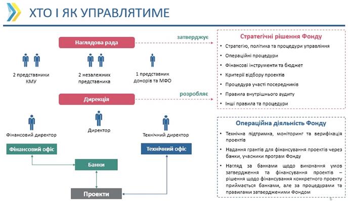 Власники будівель — клієнти фонду не матимуть контактів з чиновниками. Всі пакети стандартизовані і будуть дистанційно узгоджуватися через банки. Фонд ЕЕ надаватиме однаковий для всіх перелік вимог для отримання гранту.