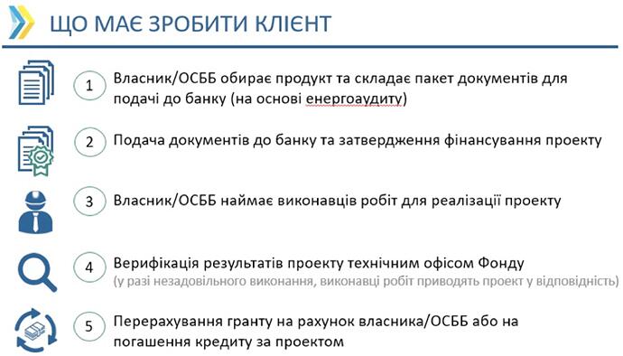 Після узгодження пакета з банком клієнт укладає угоду з будівельною компанією і отримує кредит. Після завершення робіт Фонд ЕЕ виплачує компенсацію.