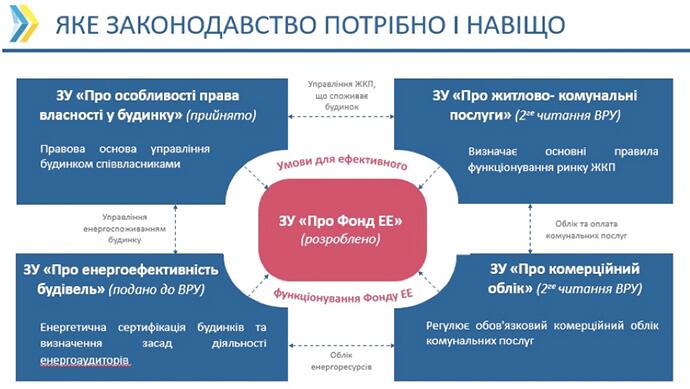Лише за рік вони сформували пакет законів для впровадження енергоефективності та створення Фонду ЕЕ. Вже чинний закон "Про права власності у багатоквартирному будинку" дає можливість ОСББ вирішувати ключові питання у будинку, оскільки це спільна власність і відповідальність жителів.