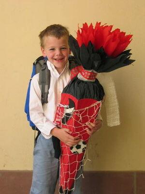 Кулек первоклассника. С первым школьным днем немецкого первоклассника связана интересная и довольно старая – с начала 19-го века – традиция: так называемый «школьный кулек». С этим большим, красиво разукрашенным кульком из плотной бумаги дети в сопровождении родителей приходят в школу в свой первый учебный день. И с ним же в руках обязательно делают свои первые школьные фотографии. Волнительный для каждого малыша момент – раскрытие в школе своего кулька: а что же туда положили папа с мамой? В старину кулек обычно наполнялся сладеньким, его так сначала и называли – «сахарный кулек». Сейчас же перекармливать ребенка сладостями не рекомендуют, так что конфет с шоколадками туда кладут немного, а заполняют его другими подарками: школьными пеналами, книжками, игрушками и т.д. Впрочем, и в старину в школьный кулек могли положить что-то прагматичное, если оно могло обрадовать ребенка. Например, в бедных семьях в былые времена таким образом могли преподнести и долгожданные новые ботинки.