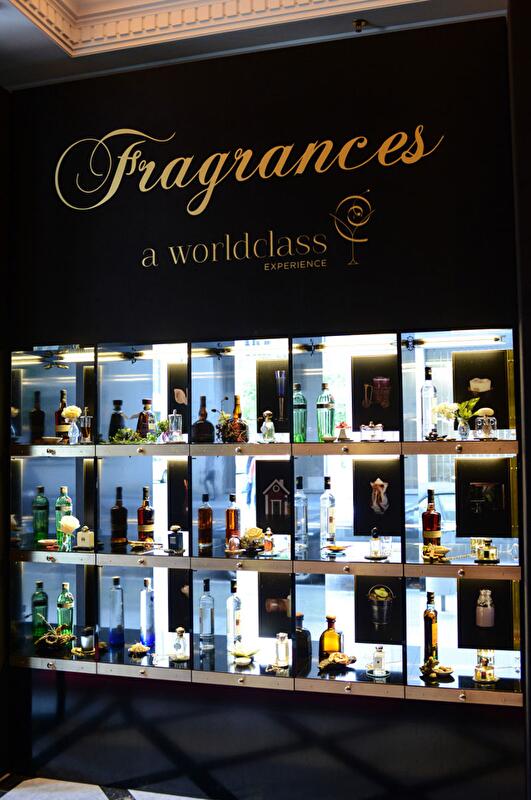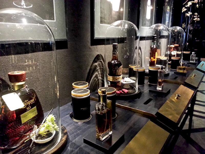 В главном зале бара выставлены 15 флаконов, у каждого из которых есть описание: название коктейля и ингредиенты в его составе. Например, в коктейль, вдохновленный ароматом Guerlain Angelique Noire, вошли жасмин, бергамот, корень ангелики, ваниль, ром и шампанское.