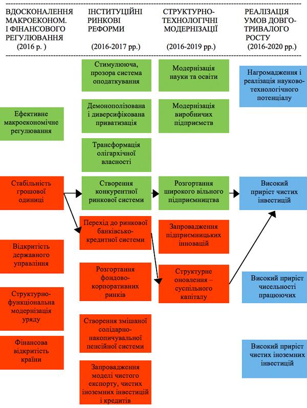 Сукупність макроекономічних, інституційно-ринкових, структурно-технологічних модернізацій, необхідних для швидкого й ефективного подолання кризи, а також умов максимального довготривалого росту економіки, показана на схемі.