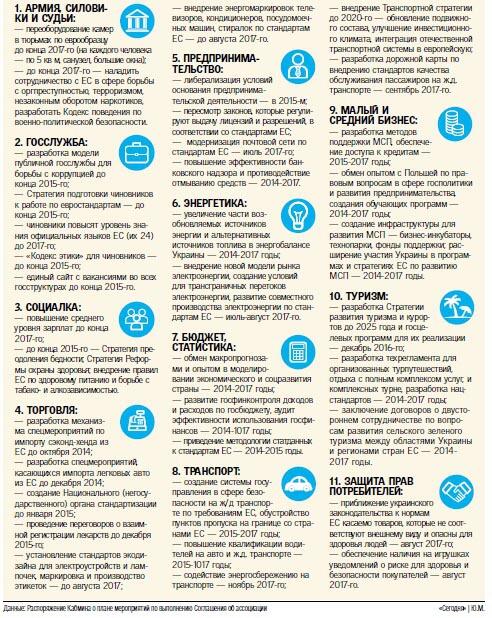 На следующий день после ратификации Соглашения с ЕС в Раде министры на своем заседании утвердили план его внедрения в жизнь. Документ почти на 90 страниц оказался в распоряжении "Сегодня" (см.инфографику — в ней основные моменты). По правительственному плану, на пути к еврожизни Украине предстоит сделать всего... 483 "шага" (столько в документе норм. — Авт.). Все их Кабмин намерен воплотить чуть больше, чем за два года — до конца 2017-го.