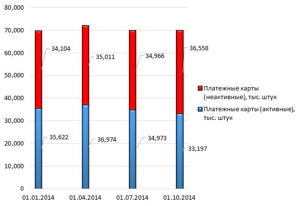 - Количество платежных карт на 1 октября 2014 года превышает 69,754 миллиона штук, что на 1,7 миллиона карт больше, чем на аналогичную дату прошлого года. При этом количество активных карт на отчетную дату составляет 33,197 миллиона единиц, что ниже показателя прошлого года на 0,663 миллиона штук;