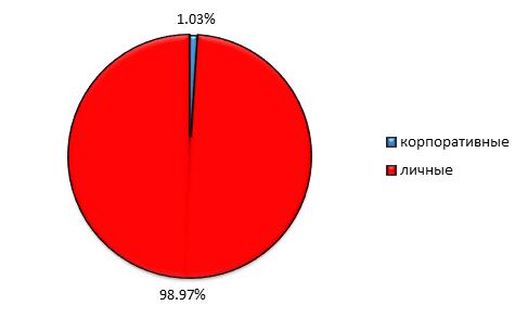 - 99% пластиковых карт – личные карты и только 1% – корпоративные (показатель за год почти не изменился);