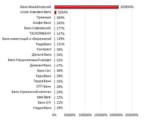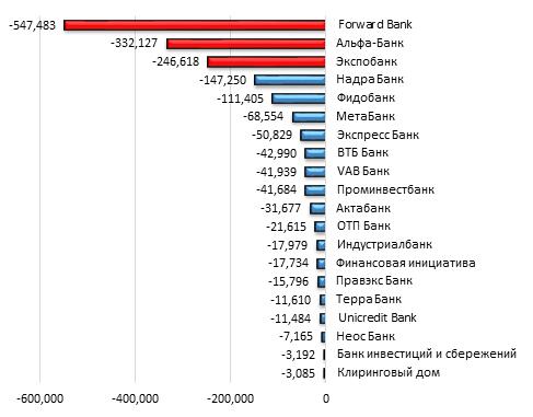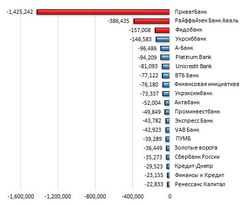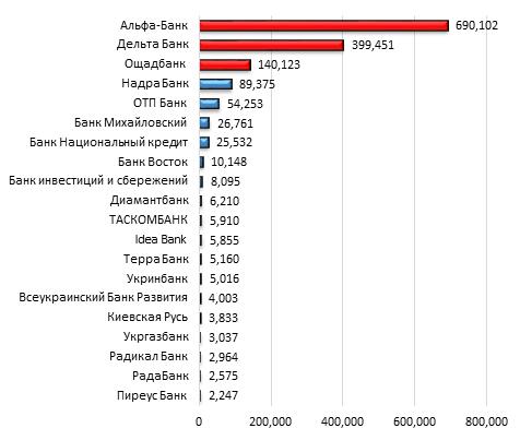 Если рассмотреть аутсайдеров по абсолютным показателям снижения количества активных платежных карт , то здесь антилидерами являются: ПриватБанк (минус 1,425 миллиона карт или минус 7,8%); Райффайзен Банк Аваль (минус 386 тысяч карт или минус 12,9%) и Фидобанк (минус 157 тысяч карт или минус 68,8%). При этом 99% из почти полутора миллионов карт ПриватБанка, ставших в этом году неактивными, приходится на жителей Донбасса и Крыма.