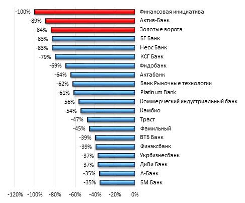 По относительному снижению количества активных платежных карт можно выделить три банка-антилидера, утративших почти все активные платежные карты: Финансовая Инициатива, а также проблемные Актив-Банк и банк «Золотые ворота».
