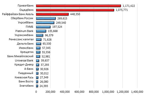 Среди банков, нарастивших количество неактивных карт за три квартала 2014 года, лидерами стали (как нетрудно догадаться из вышеподанного рейтинга снижения активных платежных карт) ПриватБанк, Ощадбанк и Райффайзен Банк Аваль.