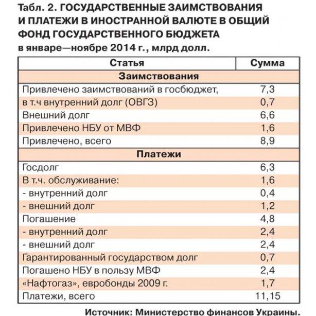 Согласно опубликованной на днях статистике Министерства финансов, только с января по ноябрь нынешнего года Украина заплатила по своим валютным долгам 11,15 млрд долл., но занять за этот период смогла лишь 8,9 млрд долл. в валюте. Причем с апреля 2013 г. Украина практически не может рассчитывать на валютные заимствования на международных рынках капитала из-за слишком высоких ставок. В результате 8,2 млрд долл. Украина смогла получить, лишь благодаря прямой помощи иностранных правительств или международных финансовых организаций.