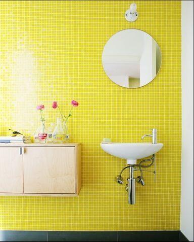 Отделать стены, пол или потолок плиткой ярких цветов – эффектный способ создать оптимистичный интерьер. Правда, в этом случае плиточная отделка станет доминантой дизайн-проекта, и подбирать мебель придется аккуратно. Цветной орнамент или однотонную яркую плитку выгоднее всего дополнит гарнитур белого или светлого древесного оттенка.