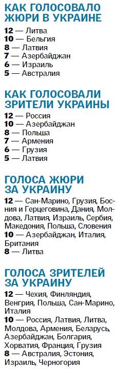 ХОРОШИЙ ЗНАК. В этом году ЕВ ярко показало разницу между мнениями профжюри и простых людей. По условиям конкурса этого года, 50% баллов участники могли получить от первых, а еще 50% — от вторых. В случае с жюри политический момент был учтен: ни российские, ни украинские судьи (у нас в их число вошли продюсер Александр Ксенофонтов, певица Мария Бурмака, гендиректор музканалов Валентин Коваль, певец Андрей Якименко и директор радиостанции Валерия Перкова) не дали Лазареву и Джамале ни балла. Зато украинские зрители отдали российскому исполнителю максимальные 12, а россияне Джамале — 10. "Это ответ на многие вопросы, — отреагировал на эту ситуацию украинский режиссер Олег Боднарчук. — Простые люди не хотят ненавидеть, воевать и ссориться. Мирные люди в разных странах имеют право на мирное сосуществование, и никто не может на это право посягать".