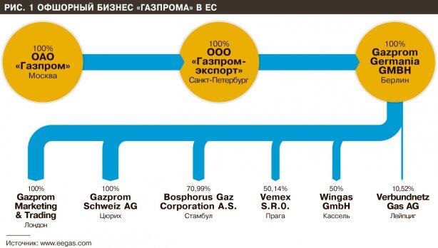 Продажу природного газа в Германию осуществляет компания "Газпромэкспорт", являющаяся 100-процентным дочерним предприятием ОАО "Газпром". "Газпромэкспорт" не только продает газ немецким компаниям-партнерам, но и имеет бизнес с компанией Gazprom Germania GMBH, которая на 100% принадлежит ей же. В свою очередь, Gazprom Germania является владельцем пакетов акций, принадлежащих ей в разных предприятиях, зарегистрированных в различных странах Европы ( см. рис. 1).