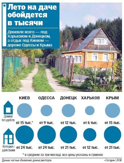 Очень активно горожане также арендуют недвижимость за городом. Из-за этого цены в городах и селах около столицы бьют все рекорды. Если в прошлом году домик за Киевом можно было арендовать летом и за 2500—3000 тыс. грн в месяц, то в нынешнем цена стартует от 4—5 тыс. Но дешевые варианты разобрали. «За 5 тысяч — это домики без удобств, да и их не найти. Большие дома стартуют от 8 тыс. грн в месяц, — рассказали «Сегодня» в агентстве недвижимости. — А хороший коттедж у озера или Днепра стоит в среднем 20 тыс. в месяц, то есть на лето он обойдется в 60 тыс. грн. Есть дома и по 80 тыс. грн за лето: в таких по несколько этажей, шикарная техника, сад». Можно снять домик и в Крыму: он обойдется на все лето в 15—30 тыс. грн (по 5—10 тыс. грн в месяц). Однако местный риелтор Александр предупредил нас: «Дешевые варианты бронировали чуть ли не с зимы, и теперь найти дачу на все лето будет сложно». Зато в Одессе предложений масса: можно найти домик и за 3—4 тыс. грн в месяц, хотя чаще предлагают варианты по 9 тыс. грн. Под Харьковом лето в неплохом домике у озера обойдется в 10 тыс. грн. А вот у жителей Донецка с зелеными зонами проблема. «У нас домов сдают очень мало, — рассказала нам местный риелтор Людмила. — Есть единственный дом в относительно чистой зоне за 7 тыс. грн — но там 250 кв. м. А так бывают домики за 3000—4500 грн. Ближайшая зеленая зона у нас — Славяногорск, Славянск. Это 100—120 км от Донецка. Там перестраивают домики и дачи специально для туристов. Иногда сдают дачи на хуторе Широкий, в 15 минутах езды от города». В Славянске и Славяногорске действительно можно провести лето: недорогой домик у озера обойдется в 3 тыс. грн в месяц, но есть варианты и по 10 тыс. грн. А вот на хуторе Широкий дачи только продают.