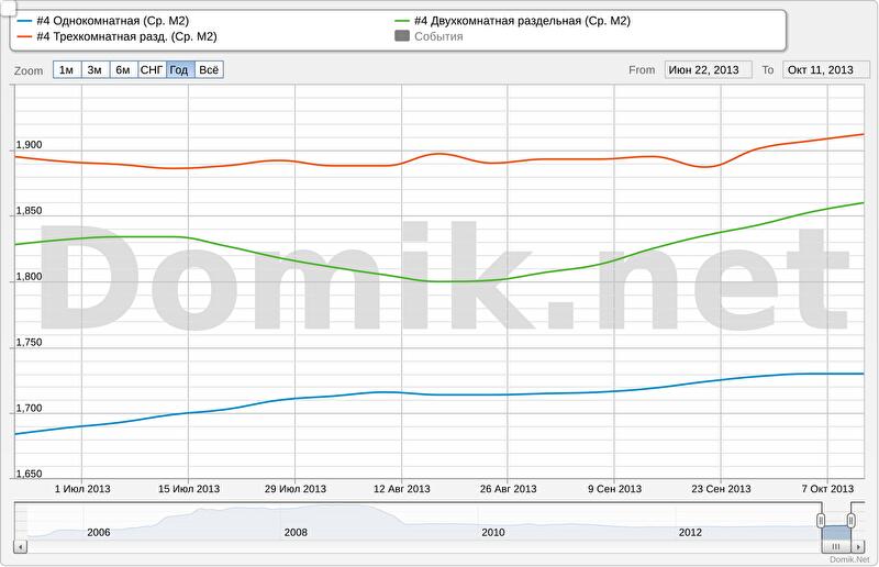 Так, например, в течение последних двух-трех месяцев наметилось подорожание одно- и двухкомнатных квартир. Но если однокомнатные квартиры подорожали совсем незначительно, в пределах 1 %, и сейчас средняя цена предложений в этом сегменте составляет $ 1700/кв. м., то двухкомнатные, по данным портала недвижимости Domik.net , подорожали с начала сентября на 2,9 %, до $ 1793/кв. м. При этом, характерно, что на треть выросло и количество предложений — это, в значительной степени, и обеспечило рост цены. Трехкомнатные квартиры после непродолжительного периода подорожания в июле-августе, сейчас дешевеют — в целом, на 2 % с начала сентября, до $ 1730/кв. м. Количество предложений здесь тоже увеличилось на 30%, то есть, реальная, а не обусловленная изменением состава предложения, цена, предположительно, упала еще больше.
