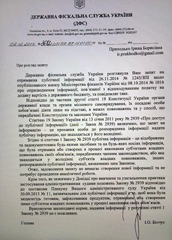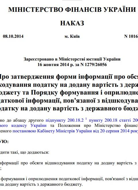 Одно время информацию о состоянии дел с НДС пыталось получить Министерство финансов, курирующее деятельность ГФС. 8 октября Минфин издал приказ №1016 " Про затвердження форми інформації про обсяги відшкодування податку на додану вартість з державного бюджету та Порядку формування і оприлюднення податкової інформації, пов'язаної з відшкодуванням податку на додану вартість з державного бюджету ".