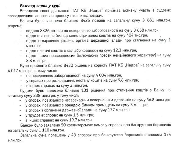 Например, на начало года некоторые вкладчики по-прежнему через суд пытаются вернуть свои депозиты в Надра Банке на сумму 36,8 млн гривен. Судятся с банком и различные госорганы, сумма претензий которых составляет минимум 177 млн гривен.