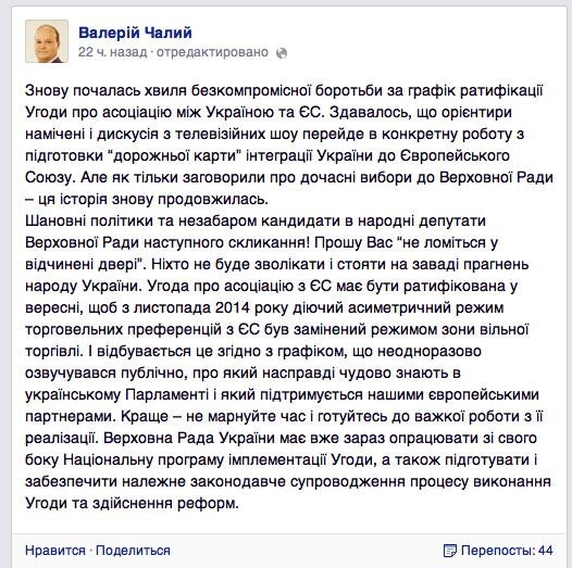 По словам замглавы администрации президента Украины Валерия Чалого , сегодня есть понимание, что ратификацию соглашения нельзя переносить. Он заверил, что максимум в сентябре это соглашение будет ратифицировано.