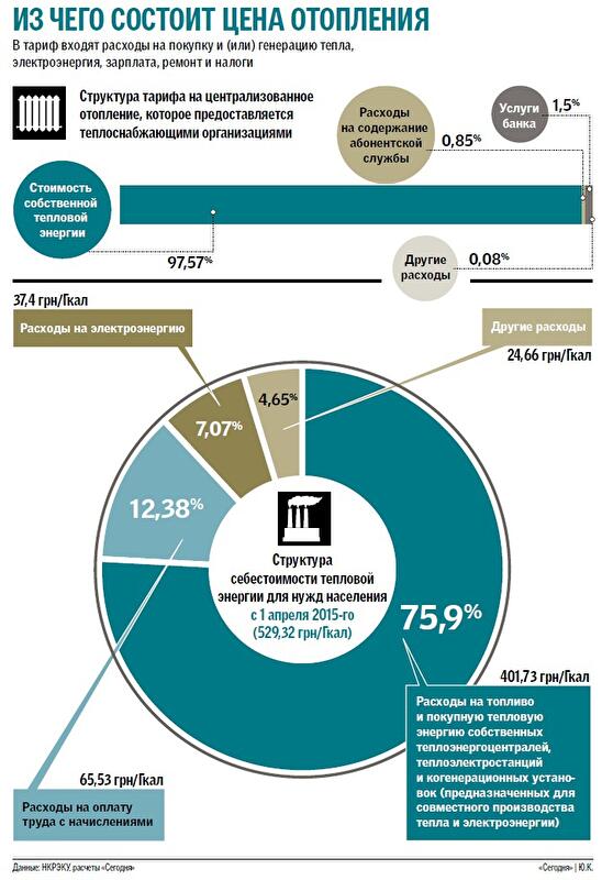 ЧТО ДЕЛАТЬ. Как видно из инфографики, основные затраты в стоимости тепла, которое отпускает коммунальщикам ТЭЦ или котельная, — это расходы на нагрев и подачу теплоносителя (97,5%): в цене тепла в батареях их почти 76%. Директор энергопрограмм Центра мировой экономики и международных отношений НАНУ Валентин Землянский считает эти цифры объективными и проблему высоких тарифов также видит в другом: непонятно, сколько тепла поставлено на самом деле, так как нет его учета. "Это проблема поставщика. Взять, например, электроэнергию — счетчики "тока" бесплатно установлены в каждой квартире, — говорит Землянский. — НКРЭКУ должна обязать компании смонтировать такие приборы в каждом доме, либо установить такие низкие нормы отопления, чтобы им стало выгоднее ставить счетчики. Так сделали с нормами по газу для бытовых плит (их уменьшили вдвое, что может оказаться накладно поставщикам газа, и они за свои деньги начнут ставить приборы учета в квартирах. — Авт.). Впрочем, жильцы могут вскладчину установить один прибор на дом в старых домах, где вертикальная разводка теплоносителя по квартирам. А в новых, где она горизонтальная, — даже индивидуально. Цена вопроса для "личного" счетчика тепла — от 10 тыс. грн, а для коллективного — от 40—70 за самый простой прибор до 150 тыс., агрегата с автоматическим погодным регулятором, поддерживающим заданную температуру в каждом жилье. Платить за тепло по общему счетчику несложно: пропорционально площади квартиры. Поверять прибор надо каждые 4 год, срок его службы — 7—8 лет.