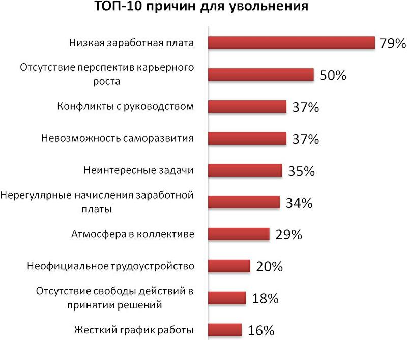 Самая популярная причина для увольнения – денежная. И хотя деньги — не всегда самый главный повод быть недовольным своей работой, в конечном итоге, именно финансовый фактор стает решающим при принятии решения. Низкая заработная плата раздражает каждого второго респондента и становится причиной для увольнения в 79% случаев. А вот конфликты с руководством, хотя и не выступают основным раздражающим фактором, все же находятся в ТОП-3 причин для увольнения. Ведь недовольство каким-либо фактором на рабочем месте может длиться долго, накапливаться или наоборот идти на убыль, но при этом не становится причиной для увольнения.