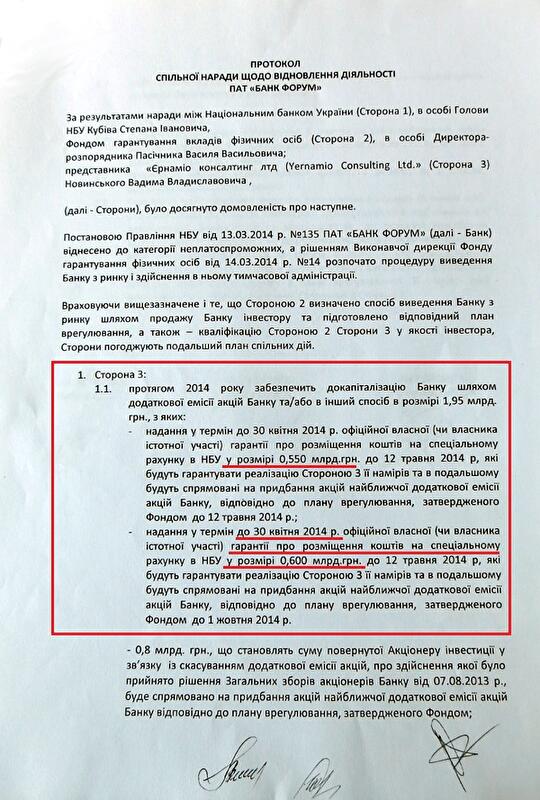 В комментарии ЭП, экс-глава набсовета "Форума" Александр Морозов говорит, что это обещание было закреплено в протоколе. Однако протокол – не юридический документ, это раз. Он носит характер декларации. А вот официальной гарантии, которая обязывала бы Новинского к конкретным действиям и имела юридический характер для Нацбанка, дано не было. Олигарх также не смог объяснить происхождение обещанных 60 млн дол. Об этом в обращении нет ни слова.