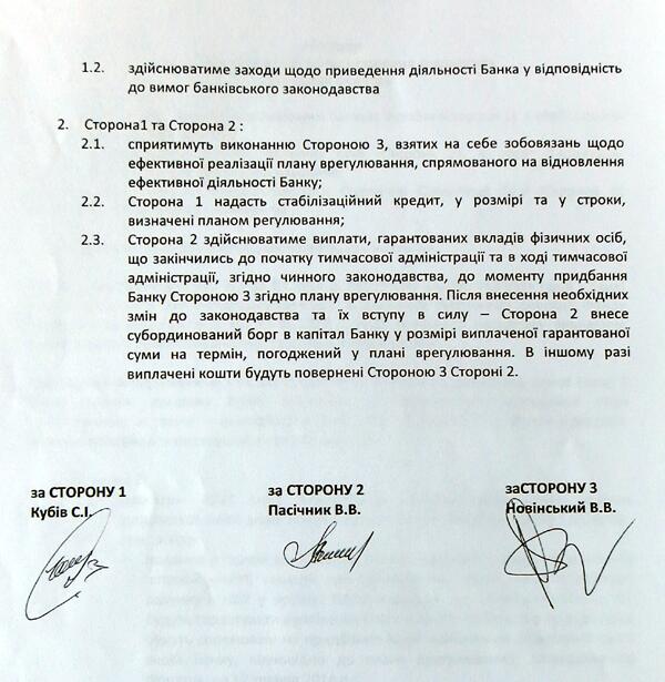 Какое предложение? Еще 29 апреля был нанят Октябрьский дворец, в котором собрали вкладчиков "Форума". Новинский, Кубив, глава Фонда гарантирования Василий Пасичный и представители вкладчиков торжественно подписали Меморандум. В нем шла речь о том, что Новинский вольет деньги в капитал банка, купит "Форум" целиком, а государство поможет банку со своей стороны.