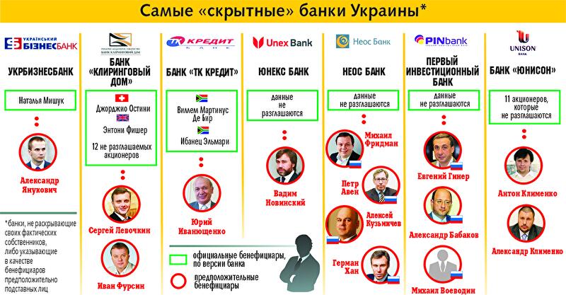 Конечно, в НБУ отлично знают, "кто есть кто", однако добиться официального раскрытия банками "инкогнито" пока или не могут, или не хотят. В прошлом году были приняты законодательные поправки, позволяющие признавать проблемными учреждения с нераскрытыми собственниками, но регулятор не торопится это делать. Еще осенью НБУ разослал подопечным письма с требованием раскрыть реальных собственников до конца 2014 г. Но информация о многих банках на сайте регулятора отсутствует до сих пор. Значит, они снова проигнорировали требование ведомства. Раскрывать бенефициаров банкиров обязывает и Закон "О внесении изменений в некоторые законодательные акты Украины относительно определения конечных выгод юридических лиц и публичных деятелей", вступивший в силу 25 ноября 2014 г. Но штраф за непредоставление данных предусмотрен смехотворный - до 8,5 тыс грн. Понятно, что собственники финучреждений, ворочающие сотнями миллионов, готовы заплатить куда большую сумму, лишь бы не признавать своей связи с банком.