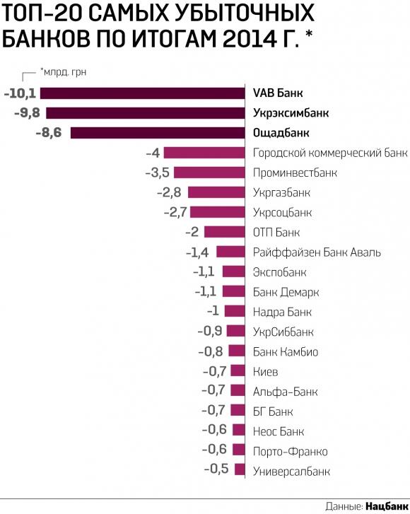 Украинская банковская система поставила по итогу 2014 г. новый антирекорд — показала убыток на уровне 52,996 млрд. грн, сообщили в НБУ. Там также уточнили, что «в минус» ушло всего 52 банка (в 2013 г. — лишь 20), то есть около трети из всех выживших в прошлом году: общее количество банковских учреждений в Украине за год сократилось со 180 до 158. До этого самым неудачным для наших финансистов считался 2010 г., когда система вышла на убыточность в 38,45 млрд. грн.