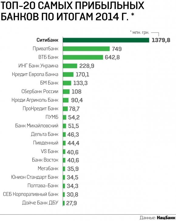 Тройка наиболее прибыльных банков, согласно статистике НБУ, выглядит следующим образом: Ситибанк с заработком в 1,4 млрд. грн., Приватбанк — 749 млн. грн. и ВТБ банк — 642,8 млн. грн.