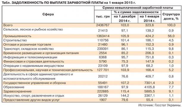 Почти 2,5 млрд грн недополучили украинцы причитающейся им оплаты труда на начало 2015 г. Цифра пугающая — за минувший год задолженность по заработной плате увеличилась без малого в три раза, а количество тех, кто не получает зарплаты, выросло до 382 тыс. человек. Рады бы чиновники и это списать на войну, да вот одним Донбассом проблема не ограничилась, задолженности фиксируются во всех без исключения областях (!).