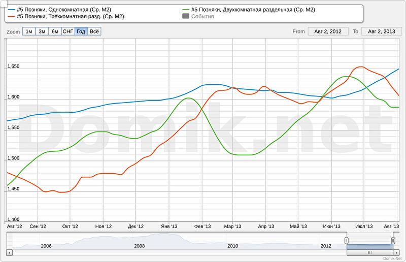 А на Позняках — массиве, хоть и удобном в отношении транспорта и инфраструктуры, но застроенном порой слишком плотно высотками класса «эконом» и ниже — квартиры в новостройках в цене, наоборот, растут: на 6,3 % за год, до $ 1627 за квадратный метр. Причем, как ни странно, здесь дорожают все типы квартир: однокомнатные на 5,4 %, до $ 1650/кв. м., двухкомнатные — на 8,7 %, до $ 1587, трехкомнатные — на 8,4 %, до $ 1605 за квадратный метр. Но, как видно на графике, если рост в сегменте однокомнатных относительно стабилен, то в других цены ощутимо колеблются, и на данный момент наметился спад.