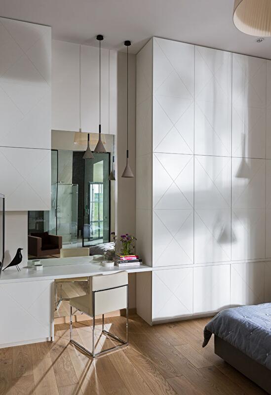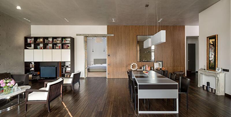 К отделочным материалам добавили белую штукатурку, декоративные бетонные панели и деревянные рейки. На пол лег фактурный массив тонированного дуба.