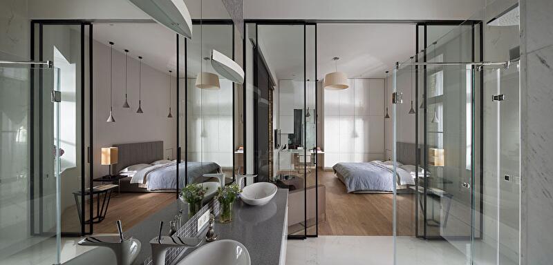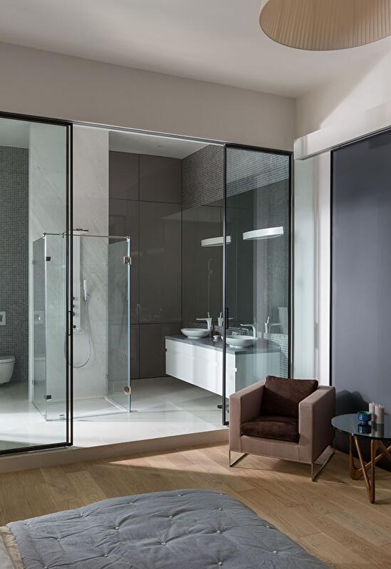 Планировочное решение выполнено в соответствии с современными канонами: с общим гостевым пространством гостиной-кухни-столовой; дальше находится детская комната и автономная зона спальни с собственным санузлом и просторным балконом, на нем дополнительно разместили ванную и небольшой импровизированный кабинет.