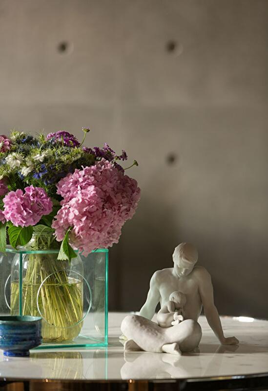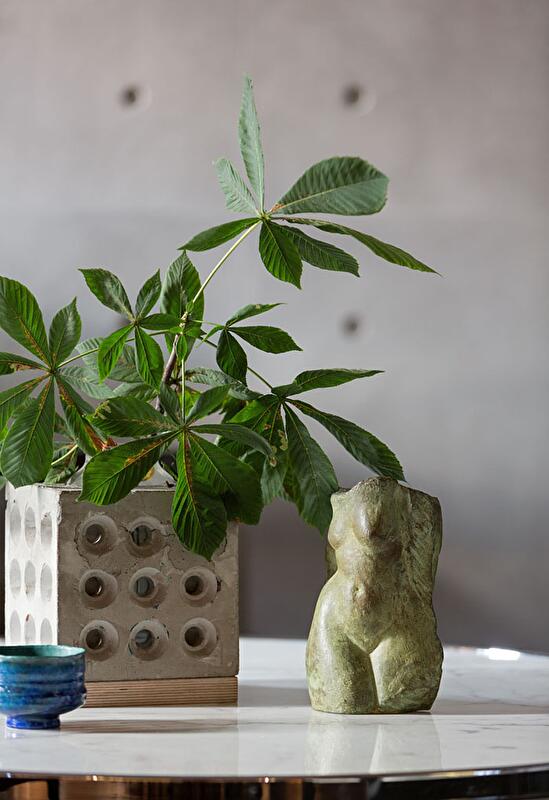 Авторские предметы «Мастерской Махно» чередуются здесь с современной классикой фабрики Minotti, промышленное освещение — с дизайнерским. Среди уникальных вещей — отлитая в бетоне псевдокаминная консоль, точная копия исторической модели, увиденная хозяином на аукционе Sotheby’s.