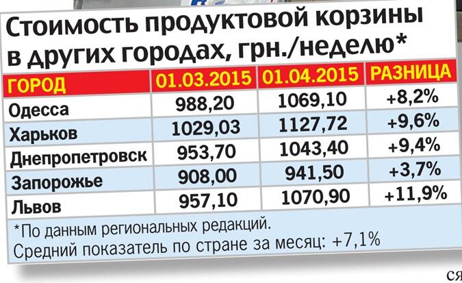 Минимальные 3,7% прибавила в этом месяце корзина в Запорожье, где в прошлом месяце был поставлен невиданный рекорд подорожания (+15,2%). Выросла стоимость молочных продуктов, круп, мяса, рыбы, овощей борщового набора, яблок. В то же время цена на сахар упала с пиковой 20 грн./кг до 15 грн., бананы подешевели с 40 до 32 грн., апельсины - с 38 до 27 грн. за кило. Такое по нынешним временам незначительное общее подорожание позволило Запорожью остаться единственным регионом страны, где сумма еженедельных расходов не перевалила за 1000 грн.