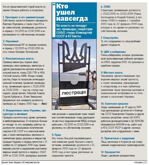 ПРОВЕРЯТ ВСЕХ. В отношении представителей власти закон прописан осторожно: например, в госорганы больше не попадут Виктор Янукович, Андрей Клюев , Виктор Пшонка, Николай Азаров — то есть вся когорта бывшей власти и... Юлия Тимошенко . А вот любого украинца, который захочет попасть в государственные органы или остаться там (это не касается только мобилизированных на фронт и срочников украинской армии. — Авт.), проверят на предмет его прошлого: к примеру, не руководил ли он местными ячейками Компартии СССР, не сотрудничал ли с... КГБ, не задерживал ли майдановцев. Под люстрацию подпадут и чиновники, которые призывали людей к сепаратизму.