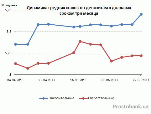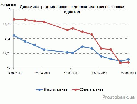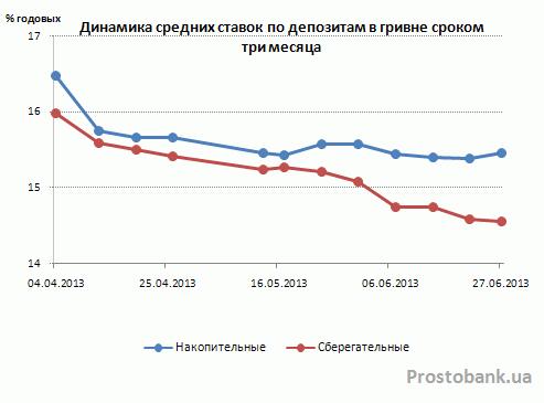 По исследованию компании «Простобанк Консалтинг», в июне-2013 по сравнению с маем-2013 падение средних ставок по вкладам в гривне от банков из числа 50-ти лидеров по активам ускорилось. Так, по вкладам сроком на год темп падения среднерыночной доходности почти удвоился – с 0,22-0,32 п.п. в мае-2013 до 0,48-0,54 п.п. в июне-2013.