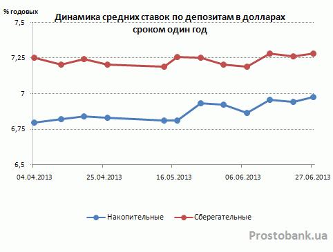 Так, по исследованию компании «Простобанк Консалтинг» на 27.06.2013 г., средние ставки по краткосрочным депозитам с правом пополнения выросли за месяц на 0,12 п.п. – до 5,7% годовых. А средние ставки по долларовым депозитам сроком на год поднялись на 0,05-0,08 п.п. – до 6,9%-7,3% годовых. Единственными же вкладами, по которым наблюдалось снижение, оказались краткосрочные депозиты без права пополнения. В частности, за июнь-2013 они в среднем по рынку потеряли 0,13 п.п своей доходности.