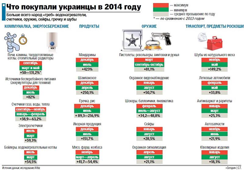 За прошлый неспокойный год украинцы стали активнее покупать водонагреватели, электросчетчики, сейфы и оружие. Такой крен потребнастроений не случаен, ведь на интересы народа повлияли события на Майдане, развитие конфликта на Востоке, подорожание коммуналки и снижение доходов. В целом углубление кризиса в стране заставило граждан включить режим экономии: к примеру, вместо ювелирных украшений больше приобретают бижутерию. "Сегодня" разобралась, как изменились покупательские интересы украинцев, на основании исследования центра интернет-торговли Allbiz, эксклюзивно подготовленного для наших читателей (см. инфографику). Аналитики изучили, какими товарами чаще всего интересовались люди в интернете.