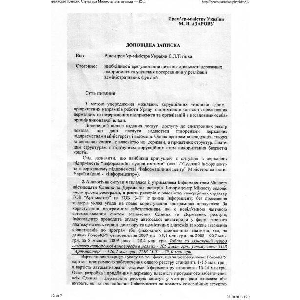 Поводом к нашим расследованиям были материалы проверки КРУ (ныне — Государственная финансовая инспекция Украины), проведенной относительно деятельности государственных реестров в 2009 г. по приказу тогдашнего премьер-министра Ю.Тимошенко, которая разоблачила вопиющие коррупционные схемы в работе министерства, являющегося олицетворением украинской Фемиды. Тимошенко не успела принять решения относительно этой проблемы. ZN.UA впервые сделало достоянием гласности результаты проверки госпредприятия "Информационный центр" Минюста. Сделка заключалась в том, что из 18 государственных реестров, администрируемых "Информцентром", в собственности государства находились только три, а остальные принадлежали "Арт-мастеру" и "3-Т", с которыми "Информцентр" заключил соглашения на пользование программной продукцией без проведения тендеров.